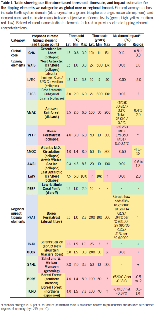 Based on this, we decided a reassessment of climate tipping elements and their potential tipping points would be timely. In the paper published yesterday in Science we reviewed over 220 papers published since 2008 covering the many tipping elements proposed in the literature, searching for evidence of tipping dynamics and extracting estimates for the thresholds, timescales, and impacts of potential tipping points. From this we categorised the proposed tipping elements according to their dynamics, synthesised estimates for their thresholds, timescales, and impacts, and assigned confidence levels in our assessments.